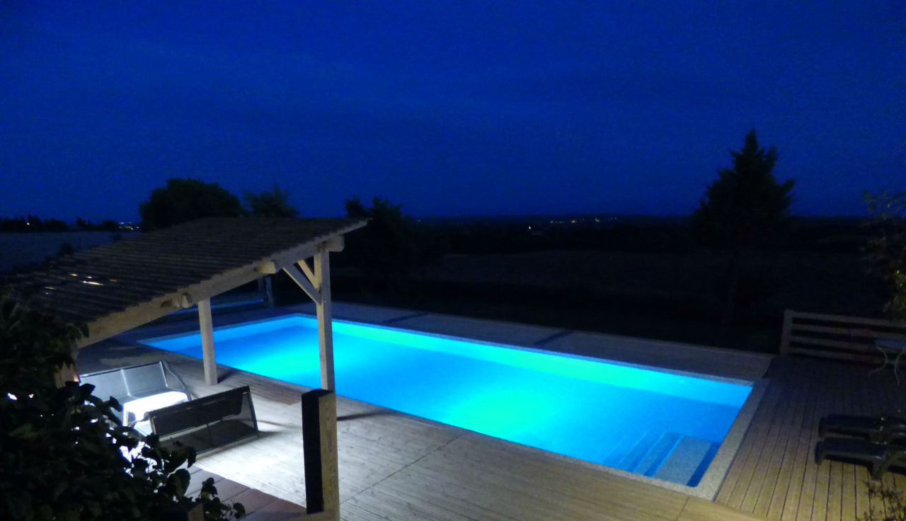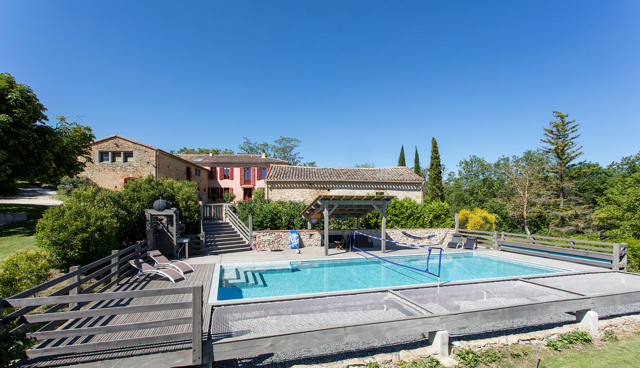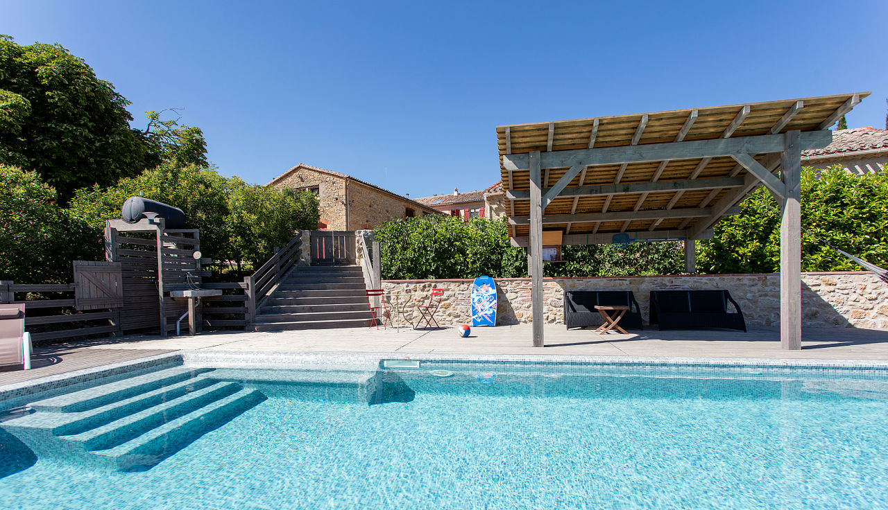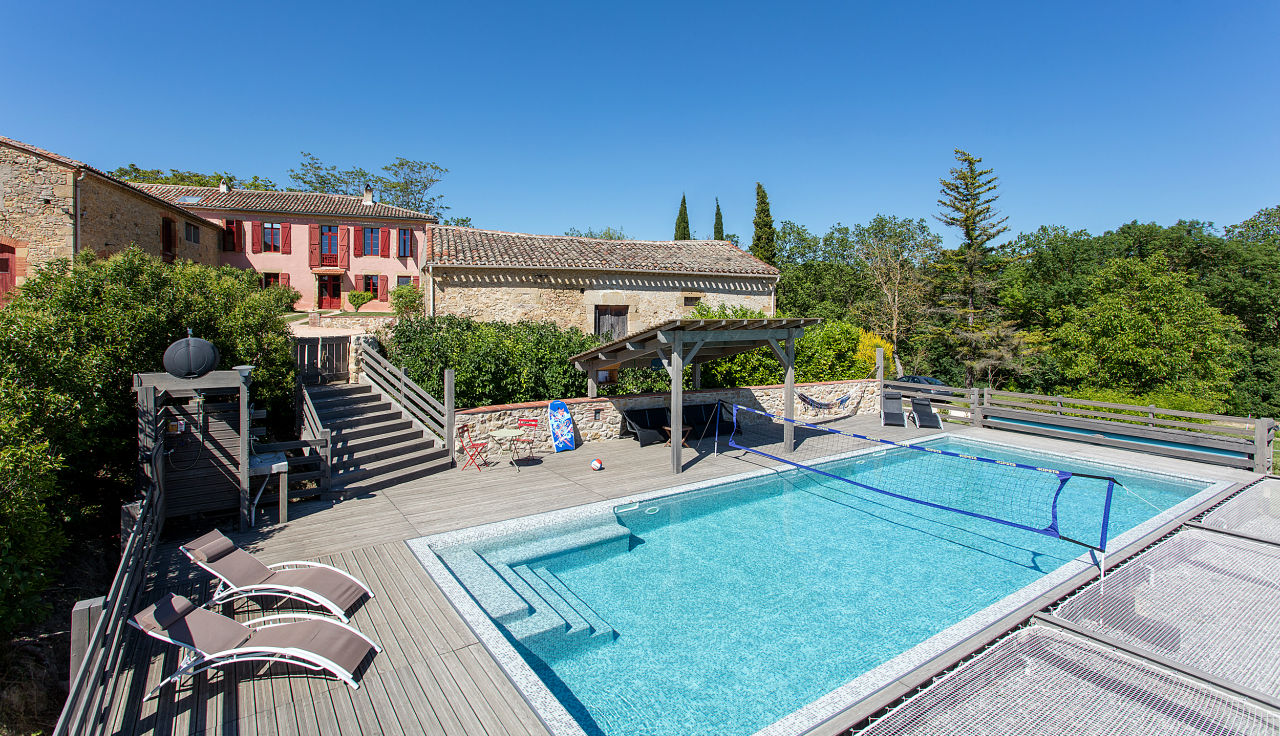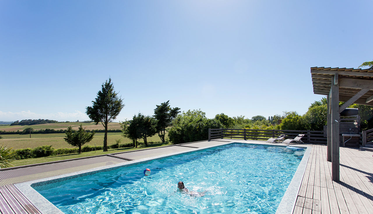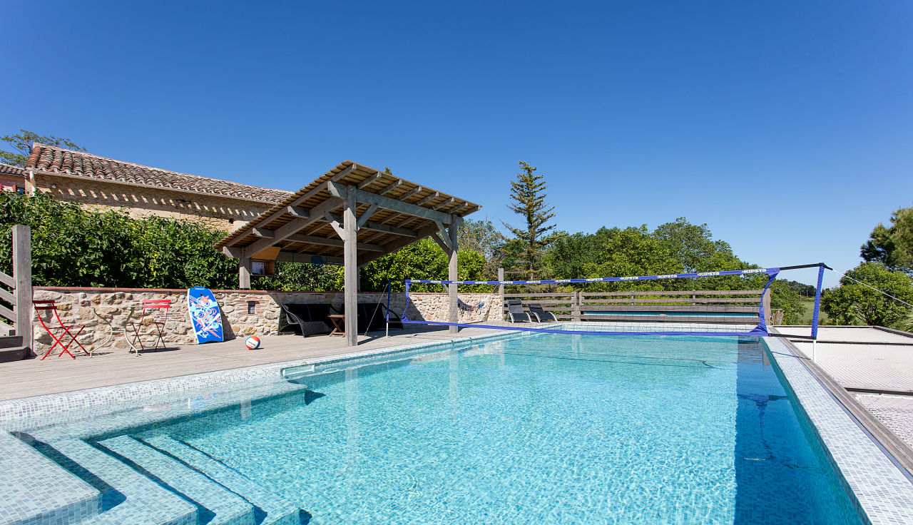 Bonheur assuré ! Le bassin de 13m par 5m est entouré d'une plage bois et d'une plage filet de catamaran. Après la baignade vous profiterez des transats géants, d'une douche solaire ou du salon d'été avec vue imprenable sur la chaîne des Pyrénées.